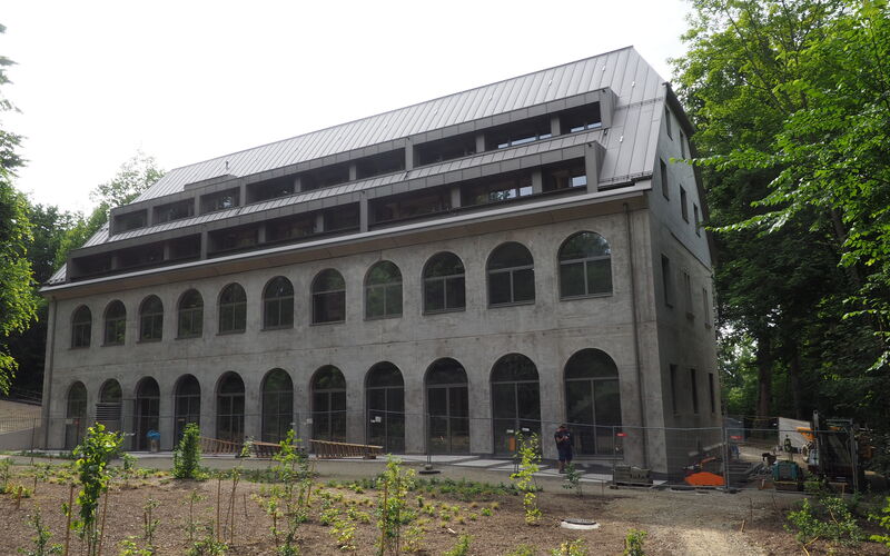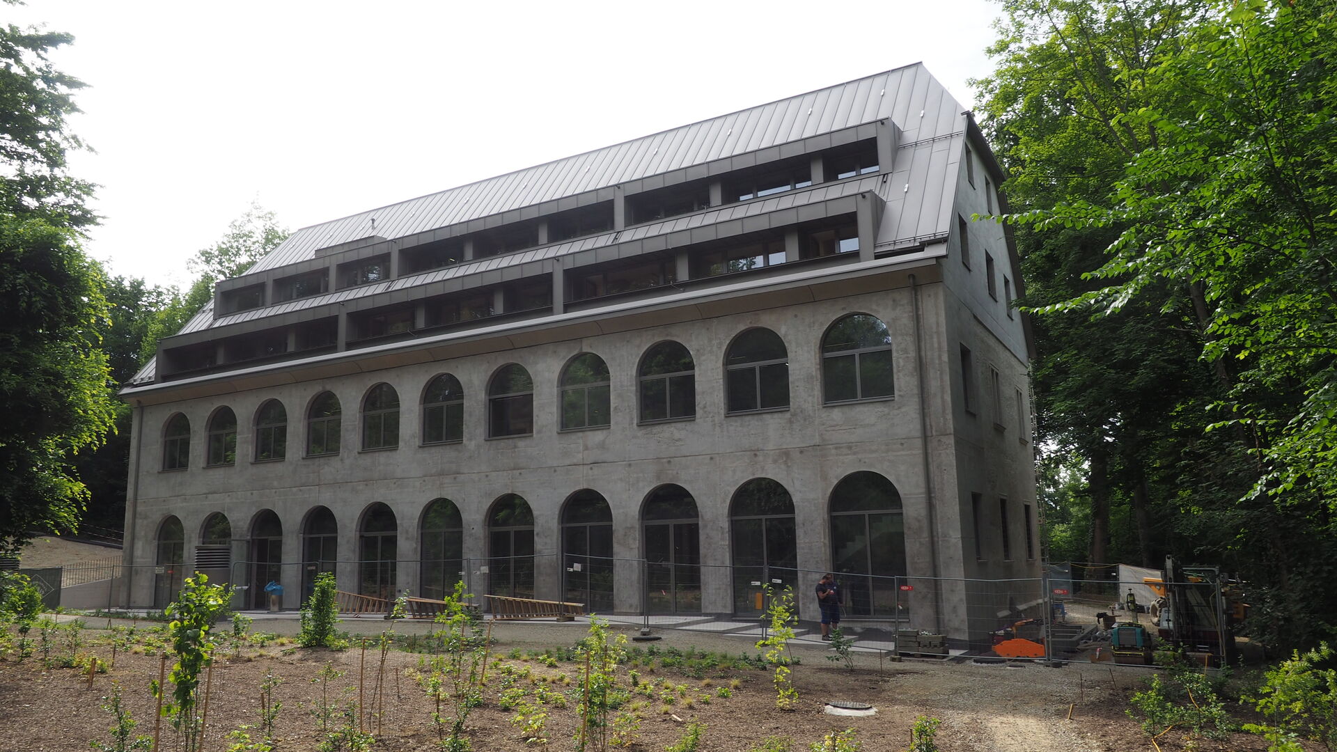 Ein Altbau wird saniert, davor entsteht ein neuer, ebenerdiger Wohnraum aus Isolationsbeton